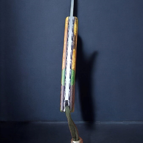 Khaki paracord lace with 2 brass beads and a bead with the 3 woods used on the knife.